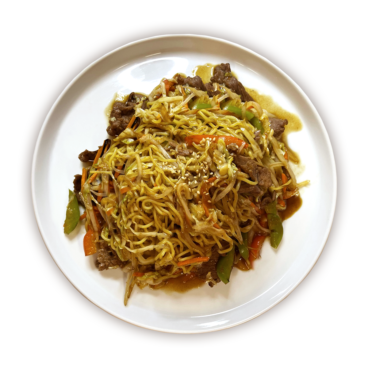 Marinated beef, sliced vegetables and chewy egg noodles wok fried with hot pepper oil & savoury sauce.