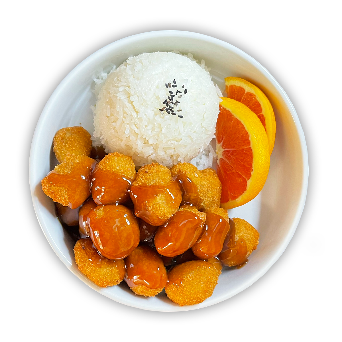 Housemade sweet & sour orange zest sauce coated on fried chicken balls served with rice.