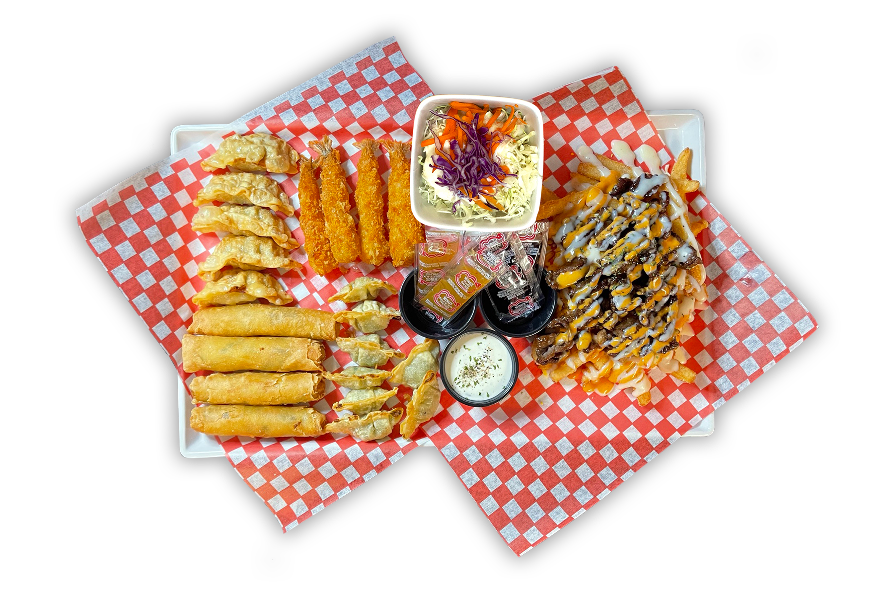 Platters with various crispy fried side menus with our very famous Bulgogi fries. 4 pieces of veggie spring rolls, 4 pieces of fried shrimp, 5 pieces of pork dumplings, 8 pieces of chicken-cilantro mini dumplings. And don’t forget to grab your choice of 2 cans of pop!